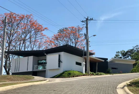 Residencia contemporánea en esquina, con diseño elegante y líneas modernas que destacan en un entorno natural.